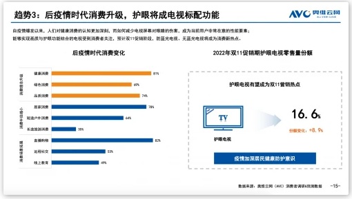 奧維云網(wǎng)《2022中國彩電市場“雙11”預(yù)測報告》預(yù)測,今年雙11促銷期間,護眼電視零售量份額將達到16.6%,相比去年提升8.9%,成為電視市場的營銷熱點。報告觀點基于當下消費者心理的變化預(yù)測而來。自疫情爆發(fā)以來,人們對健康消費的認知更加深刻,如何減少電視屏幕對眼睛的傷害,成為當前用戶非常在意的性能要素。能夠?qū)崿F(xiàn)畫質(zhì)與護眼功能結(jié)合的電視受到消費者關(guān)注,防藍光電視、無藍光電視將成為雙11家電消費新熱點。