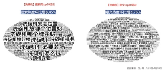 住小幫洗碗機品類詞云顯示,【洗碗機】相關搜索詞和文章均獲得了更多的曝光關注。住小幫分析發現,【洗碗機】TOP30搜索詞詞云主要由洗碗機選購必要性、品牌咨詢、選購指南、安裝咨詢等關鍵詞構成,搜索熱度環比增長45%;而【洗碗機】TOP30熱文詞云中,以洗碗機選購必要性和避坑干貨選購指導為主題的文章更易吸引讀者興趣,整體曝光熱度環比增長76%。這意味著,京東家電通過此次活動強化了洗碗機趨勢品類聚合優勢。