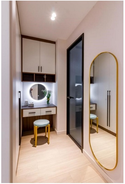 嵌入式的壁柜可以用作化妝臺,亦可作為簡易的書桌,閑暇時坐下來看看書,也是一種無比輕松的享受。