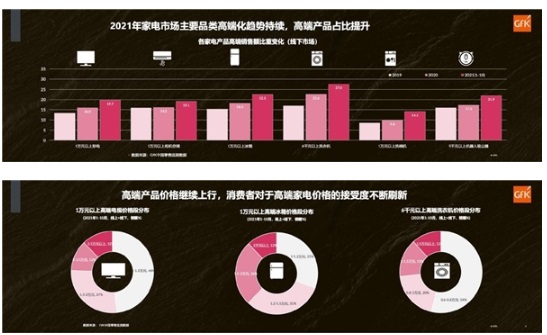 根據紅頂獎組委會和GfK中國聯合發布的《2021高端家電市場白皮書》內容顯示,2021年1-10月份,1萬元以上冰箱、彩電、柜機空調、洗碗機線下零售額占比較2020年均有不同程度的提升,消費者對于高端家電價格的接受度也不斷提高,進一步增強了高端市場增長的信心。