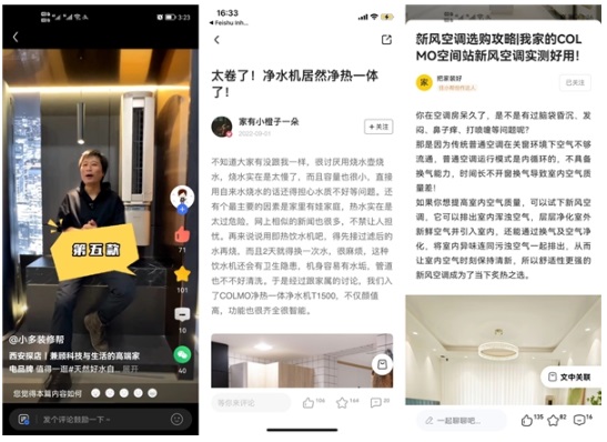 線上,COLMO則聯合設計師及達人,更有的放矢地產出優質種草內容。在探店視頻中直接安利優勢產品,或根據家居風格和戶型大小推薦電器,COLMO在住小幫上打造出了一片屬于自己的內容陣地,吸引了大量目標用戶。