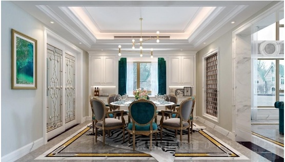 餐廳區域,布局上的軸線對稱貫穿始終,恢弘的氣勢,典雅的氛圍,并非追求浮夸外露的虛榮感,依舊保有居家的生活基調,滿足生活需要,還賞心悅目。
