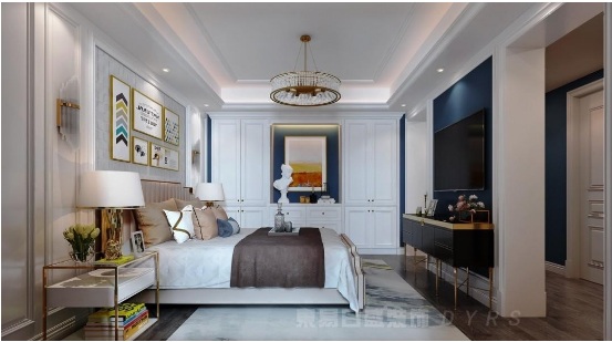 臥室白色護墻板搭配頂天立地收納柜,軸線對稱的線條感硬朗摩登,金屬線條游走空間各處角落,無不彰顯著新新資產階級的高雅時尚生活方式。