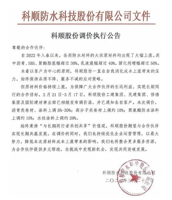 3月23日消息,據科順股份官微,因原材料價格持續上漲,2月21日-3月17日,科順股份工建集團、民建集團、修繕集團及國際建材事業部已相繼發布調價函。