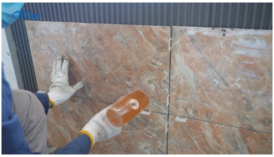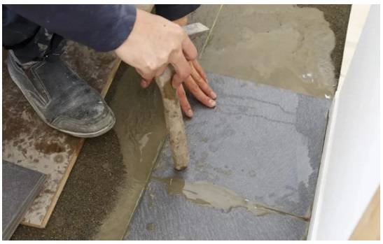 使用膠錘在瓷磚上表面均勻敲打