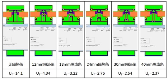 1)聚酰胺尼龍隔熱條的應用與否對于框的U值有著至關重要的影響,相比非斷熱的框,12mm隔熱條可以大幅降低框的U值達69%,性價比極高,這就很好解釋了自2005年國家頒布《公共建筑節能設計規范》后,隔熱條的應用被迅速和廣泛地普及開來。