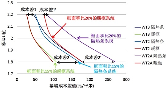 3)比較有機隔熱系統和暖框系統的性價比,當成本相同時,后者框的U值比前者平均降低45%;當框的U值相同時,后者的成本僅為前者的1/3。