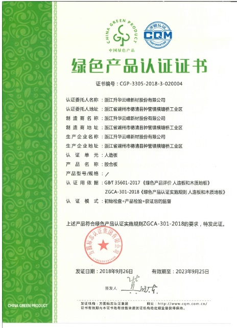 湖州權威認證機構通過對照國家首批12項綠色產品評價標準清單及認證目錄,遵循綠色產品標識認證規則,確定相關產品在全生命周期中符合特定的資源能源消耗少、污染物排放低、低毒少害、易回收處理和再利用、健康安全和質量品質高等指標要求,為莫干山板材頒發了“綠色產品認證”證書。