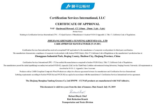 作為家重點高新技術企業、國家林業重點龍頭企業、國家綠色供應鏈示范企業、國家木竹產業技術創新戰略聯盟“非醛類膠黏劑人造板新產品創制基地”,莫干山板材是行業首批通過ISO14001國際環境管理體系認證、中國環境標志產品認證和美國CARB認證等三大國內外權威認證的生產企業,同時擁有美國CARB-NAF無醛豁免認證、入美海關C-TPAT綠色通行證。2018年,莫干山板材成為全國首批通過“綠色產品”認證的企業,其膠合板、生態板、細木工板等品類產品能合法使用綠色產品標識。