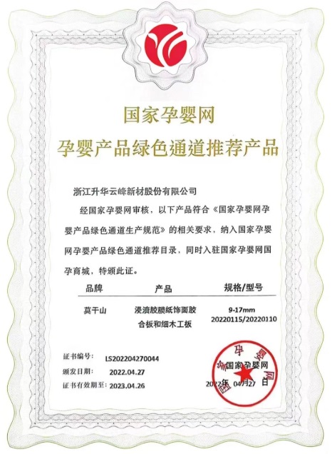 2020年,莫干山板材獲得中國環境標志產品認證和“兒童安全級產品”認證。2021年11月,莫干山板材膠合板、細木工板、飾面人造板等產品以市場隨機抽樣方式獲得了由國建聯信認證中心(GJC)依據GB/T 39600—2021《人造板及其制品甲醛釋放量分級》標準頒發的無醛人造板分級認證證書,莫干山板材被鑒定為ENF級,莫干山板材也成為行業首個獲得該證書的企業。今年4月,莫干山浸漬膠膜紙飾面膠合板和細木工板符合《國家孕嬰網孕嬰產品綠色通道生產規范》和國家孕嬰網《托育與孕嬰居所環境安全防控規范》(Q/GJYY111.1-2020)的標準要求,被正式納入國家孕嬰產品綠色通道推薦目錄,同時獲得了“國家孕嬰網入網推薦證書”。