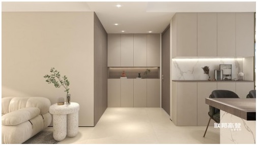 進門感受原木色帶來的溫暖如初,無形緩解著奔波在外的疲與累;入戶柜中部設計鏤空,為進出便利做足準備。