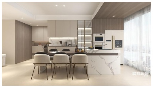 餐廚中有煙火,也未嘗不可與詩相逢。與墻同寬的挑高餐邊收納柜,通透玻璃為其質感點綴;中部島臺大理石溫潤紋路與餐桌一體自然聯系,盡享溫馨食光。