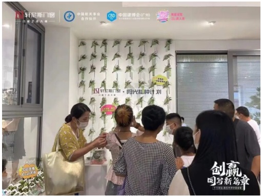大量的綠植的氛圍營造,將區域打造成集互動、打卡拍照、短視頻創作等內容生產為一體的互動美陳空間,大量UGC進入私域傳播,讓軒尼斯門窗在建博會眾多品牌的流量搶占中拔得頭籌。在這里不僅可以獲得一份新鮮有趣的植物,或者就單純的沉浸在空間中,享受植物制造的氧氣;也可以從中打包希望,播種希望,選擇屬于自己的植物,把光帶回家。