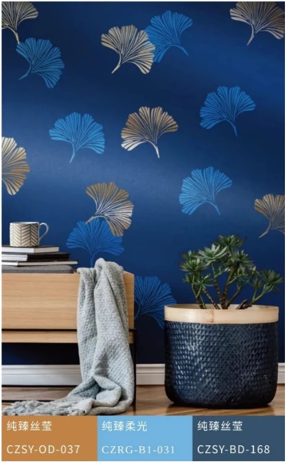 妖姬藍與粘土橙交相輝映,恣意舞動的銀杏葉點染墻面,波光粼粼的絲瑩效果撲面而來,繪畫出一派靈動鮮活的景像。隨著光線耀動的純臻絲瑩,柔潤細致的純臻柔光,為家居色彩增添了氣質非凡的光澤,盡顯沉靜自然的舒心氣息。