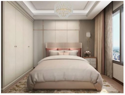 主臥通過不同材質和線條的運用增加層次感,整體色調以素雅的淺色系為主讓空間面積感覺更大,床頭溫柔粉靠墊的點綴,營造出浪漫溫暖的感覺。