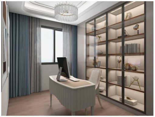 簡約線條的淺色系書桌椅,一面及頂的定制書柜,滿足書籍和擺件等物品的陳列,蘊藏輕奢美學的玻璃柜門,增加室內通透性,淡藍色定制窗簾的點綴,靜享閱讀時光。