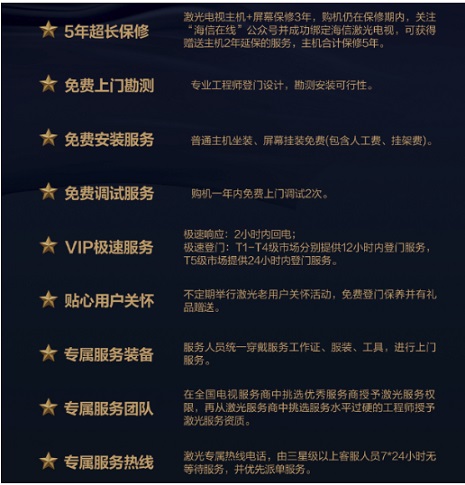 海信激光電視擁有高于行業(yè)的服務(wù)標(biāo)準(zhǔn)。屏幕保修3年,主機(jī)保修5年。相較市面上其他電視產(chǎn)品,擁有更長的保修時(shí)間,免除用戶的后顧之憂。安裝前的勘測、安裝調(diào)試等服務(wù)均免費(fèi)。所有用戶需求均由三星級以上專業(yè)客服人員接待,7*24小時(shí)無等待服務(wù)。