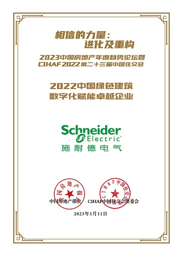 中國北京,2023年1月12日——近日,2023中國房地產年度趨勢論壇暨CIHAF第二十三屆中國住交會在北京舉辦。會議上,多位政商學界精英與行業頭部企業共同探討了未來房地產行業高質量發展之道,舉辦方還對過往一年里在行業中具有突出影響力的企業進行了獎項認證。憑借在房地產行業領先的數字化經驗和推動低碳可持續發展的實踐,施耐德電氣獲得了2022中國綠色建筑數字化賦能卓越企業這一殊譽。