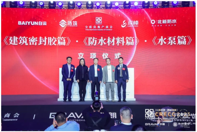 全聯房地產商會副秘書長秦晶女士;全聯房地產商會鏈筑分會副秘書長張旭先生;北新防水副總經理張弘先生;全聯房地產商會鏈筑分會常務理事會員單位、廣州白云科技股份有限公司市場部副經理扶浩先生;全聯房地產商會鏈筑分會常務理事會員單位、上海成峰流體設備有限公司市場部總監沈杰先生為“建筑密封膠篇”和“防水工程篇”“水泵篇”三項應用指南啟動立項。