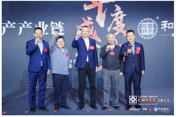 在隨后的祝酒環節,全聯房地產商會黨委常務副書記、秘書長、鏈筑分會會長趙正挺先生;全聯房地產商會鏈筑分會戰略發展顧問、住建部市場監管司原副司長劉哲先生;全聯房地產鏈筑分會副會長單位、德國貝朗(中國)副總裁楊磊先生;全聯房地產商會副秘書長、鏈筑分會秘書長馬學明先生與盛典冠名單位——佛山和邦盛世家居有限公司副董事長劉爭光先生,共同為本年度的盛典晚宴祝酒。