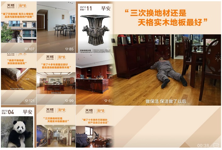 為讓“緣分”形成口碑裂變,天格也在通過真實故事的方式影響更多可能“一起走”的潛在用戶。天格在微信視頻號中推出了一個名為“用戶說”的視頻系列,從2023年8月起陸續發布的20期視頻,都是用戶主動“代言”,親口講述他們選擇和使用天格地板的真實體驗和感受。