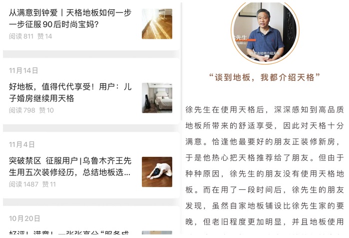 打開“天格地暖實木地板”微信公眾號(以下簡稱“官微”),翻閱以往發布的內容,可以看到有超過一半的內容,都集中在真實用戶的口碑方面。如“從滿意到鐘愛|天格地板如何一步一步征服90后時尚寶媽?”、“好地板,值得代代享受!用戶:兒子婚房繼續用天格”、“突破禁區、征服用戶|烏魯木齊王先生用五次裝修經歷,總結地板選天格的三大理由”.......從傳播角度可以看出,天格地板的傳播并沒有止步于高大上的官方內容,但卻用一個個真實的案例,通過用戶的真實采訪,傳達出天格“以用戶為中心”的品牌理念。