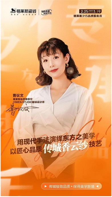 格萊斯瓷磚攜手服裝設計師曹議文的”品質傳城 安居到家“315營銷活動,以堅守美與品質為抓手,挖掘格萊斯作為品質瓷磚品牌的內生力,借由曹議文老師,演員時期對于演技的打磨,演繹路上永不停歇的探索、服裝設計師時期對于面料的選材,服裝最大化體現(xiàn)女性之美的追求,深化品牌的品質基因。