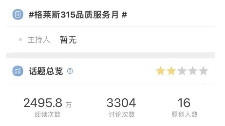 截至目前,#格萊斯315品質服務月#已超過2400W閱讀量,成為開年315營銷活動中撬動網(wǎng)友神經的重量級話題,在這一聲量傳播的過程之下,話題也以UGC原創(chuàng)內容互動與創(chuàng)作,有效沉淀優(yōu)質內容。