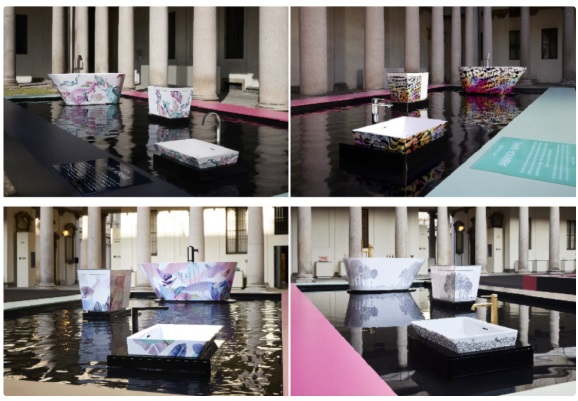 此次,科勒在歷史悠久的塞納托宮(Palazzo del Senato)首次展出了150周年紀念藝術系列(The Artist Editions™ 150 Collection),包括Falling Gently、Aranya、Flora Tropical和A World on String四個系列,分別出自美國街頭涂鴉藝術家ELLE、印度藝術家Pushpa Kumari、巴西街頭藝術家Ananda Nahú和中國新銳藝術家汪紫菱。這四位以敢創藝術實踐而聞名的藝術家們,以風格迥異的藝術圖案,依托科勒紐密聲光智能座便器、凌越時尚臺盆和凌越靈雅石浴缸產品為“畫布”,營造出層次鮮明的色彩,傳遞對敢創的獨到理解。該系列的每一件產品都將限量發售150件,以慶賀科勒品牌成立150周年。