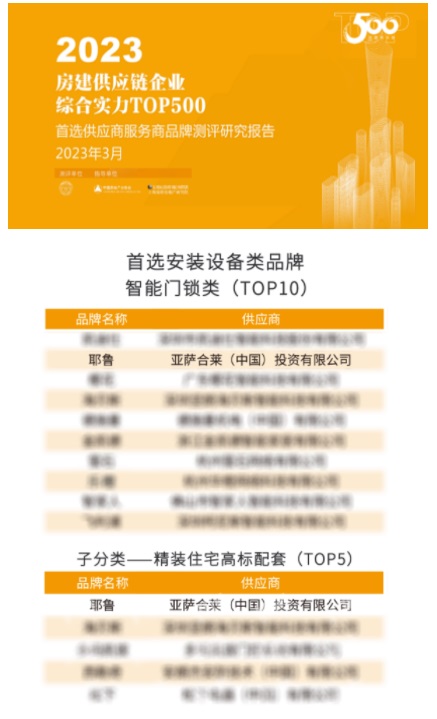 近日,中房?jī)?yōu)采測(cè)評(píng)正式發(fā)布《2023房建供應(yīng)鏈綜合實(shí)力TOP500-首選供應(yīng)商服務(wù)商品牌測(cè)評(píng)研究報(bào)告》(以下簡(jiǎn)稱(chēng)報(bào)告),耶魯作為智能鎖高端品牌,再次榮膺“2023房建供應(yīng)鏈綜合實(shí)力TOP500首選供應(yīng)商”,并在智能門(mén)鎖·精裝住宅高標(biāo)配套類(lèi)位居榜首,及智能門(mén)鎖大類(lèi)的第二名,彰顯耶魯品牌強(qiáng)勁實(shí)力,續(xù)寫(xiě)品牌榮耀。