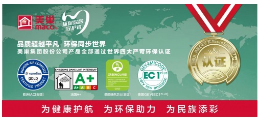 值得一提的是美巢的旗下產品全部通過了多個世界四大環保認證的最高級:美國UL綠色衛士【金級】認證、歐洲Eurofins IAC【金級】認證、德國GEV【EC1PLUS】認證以及法國【A+】標準,環保與智能同頻共振,帶來更好的裝修效果。