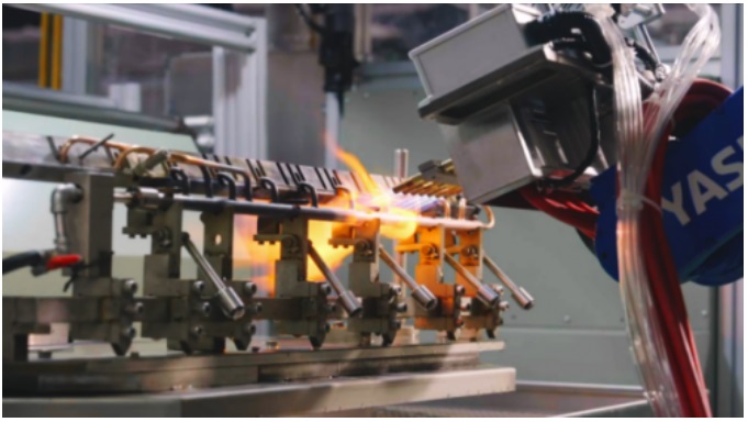 自動化焊接環(huán)節(jié),海信日立行業(yè)自研首創(chuàng)多點焊接、不等加熱、高精度視覺引導和參數(shù)補償方案,實現(xiàn)用工提效63%,焊接不良率下降57%。物流環(huán)節(jié),史無前例地將“天車”引入空調(diào)行業(yè),采用空中物流即時配送系統(tǒng)的方式,替代傳統(tǒng)懸掛鏈方式,提高物流效率。