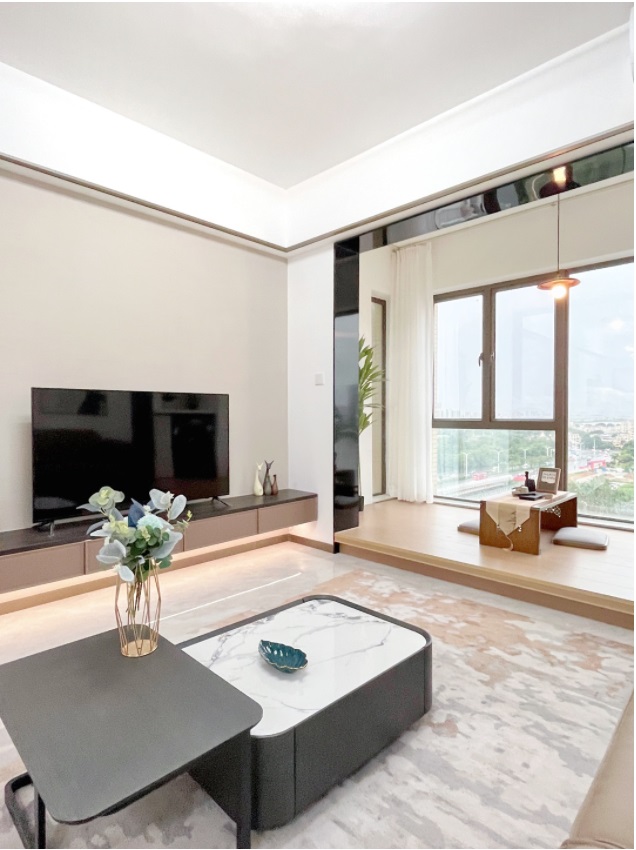 業(yè)主希望在客廳有一個可以發(fā)呆躺平的地方,設(shè)計師便將這個8平米的陽臺,巧妙地改造成了一個雅致的小茶室。地板抬高設(shè)計,搭配柔軟的坐墊和小巧的桌幾,仿佛踏入了一個日式禪意的小天地。在這里,一壺清茶,幾縷陽光,窗外風(fēng)景如畫,讓人心曠神怡。