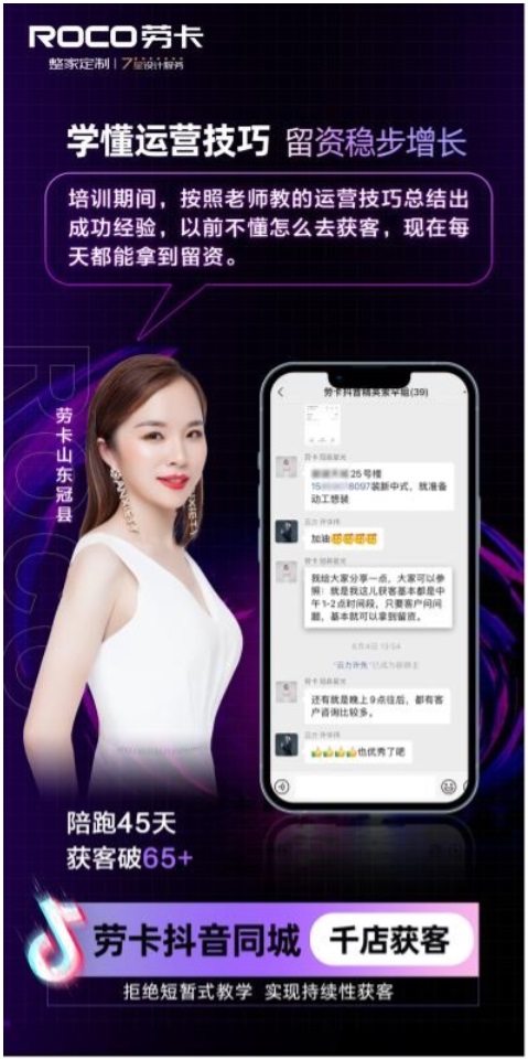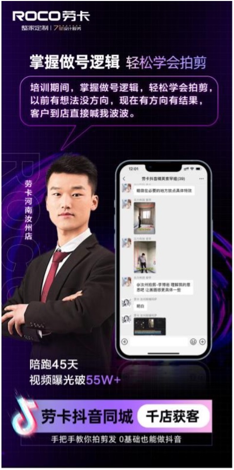 勞卡邀請專業的第三方團隊圍繞“精準獲客”的戰略目標開發培訓課程,在2023年接連開展多場抖音同城千店獲客培訓營,全國超一半經銷商參與。從IP打造、腳本創作、拍攝剪輯、數據分析等多維度解讀終端門店的抖音同城運營之道。