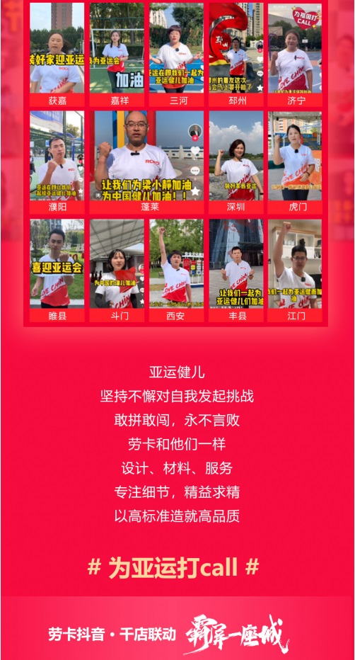 比如在2023年亞運會期間,勞卡將亞運會高流量的“天網”和同城精準流量“地網”相結合,勞卡依托其抖音同城IP矩陣掀起“千店聯動 霸屏一座城”的體育營銷。通過聯動媒體和全國經銷商打call發聲、多重營銷玩法,借助其品牌體驗官、中國女飛人梁小靜的名人效應,放大關注度收獲自然流量。勞卡將營銷節點和賽事節點緊密結合,持續創作,成功集結了冬至、跨年、元旦等多個節點,為2024年帶來了一場引人注目的抖音跨年盛典,撬動情感消費體驗,實現品牌曝光、品牌種草到轉化的高效“質變”。