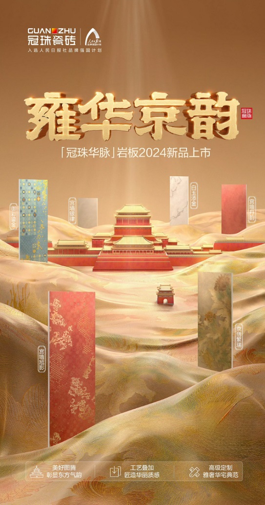 “宮墻丹韻”是來自于冠珠華脈巖板的系列“雍華京韻”中的一款產(chǎn)品,取材自京城“宮墻美學”,以富有設計感的設色與圖案復原了宮墻斑駁與疏影落落的生動古典意境。而“雍華京韻”整個系列都延續(xù)了冠珠華脈巖板“以龍為魂,以陶為根,以城為脈”的設計理念,以“金瓦紅墻,丹韻銀律”的美學結(jié)合“高定”的制造工藝與鋪設技藝,開啟“高定巖板”新風尚。
