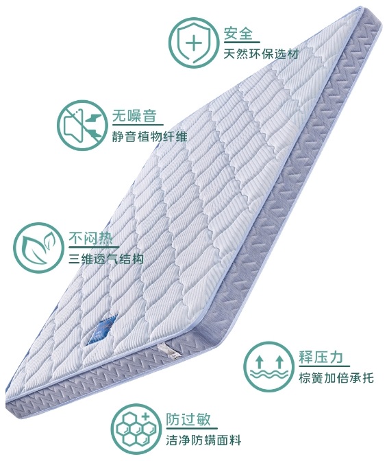 材質方面,床墊采用來自東南亞的3D清新護脊椰棕材質,天然環保,并經過高溫熱壓成墊,過程中沒有使用一滴膠水,健康又安全。除此之外,這種椰棕材質還具有立體支撐護脊的特性,既能多點位強韌支撐身體,幫助脊椎自然舒展,又能舒緩脊椎僵硬感,讓您在任何睡姿下都能享受到舒適的支撐。