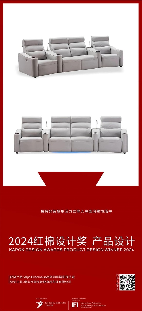 在2024年紅棉設(shè)計(jì)獎(jiǎng)參評(píng)設(shè)計(jì)中,御虎家居Royal Tiger研發(fā)的阿爾卑斯影院沙發(fā)獲評(píng)審團(tuán)體的高度關(guān)注與肯定。
