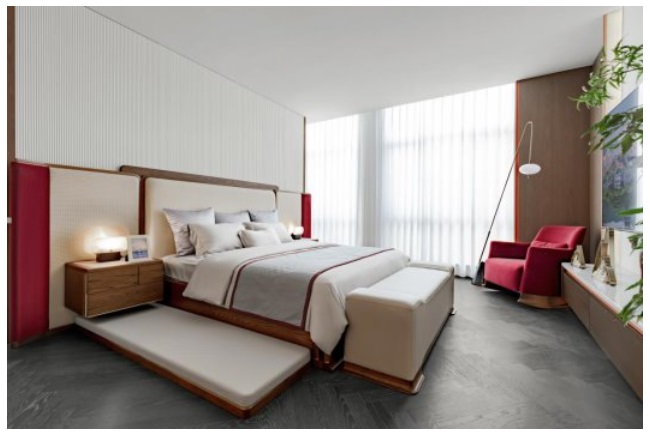 榮獲金獎的華閣生活「云舒」臥室,這款大床端莊厚重,造型獨(dú)特,使整個空間更顯大氣。床左右兩邊各有一個床榻,源自我國古代拔步床,營造出一種走階梯、步步登高的感覺,讓入睡更具儀式感。