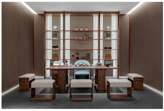 榮獲金獎的華閣生活「沐茗」茶室,以“天地乾坤,白紙濡墨”為概念,欲顯而隱,營造出空靈深遠(yuǎn)的東方意境之美。整墻設(shè)計的茶柜——取型于中國傳統(tǒng)多寶閣,有多財多寶之意。錯落擺放著少量而精致的茶具及藏品,形成虛實有無的對比平衡,勾勒出空間里的裊裊禪意。茶桌造型源自中國古建筑中的梁架結(jié)構(gòu),緊固敦實,雄渾莊重。線條利落明朗,轉(zhuǎn)折自然貼切。桌面中間內(nèi)嵌硯石茶盤致密而細(xì)膩,置于席間可用可賞,茶趣盎然,為一場美妙茶事增添幾分文人書卷氣息。