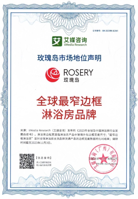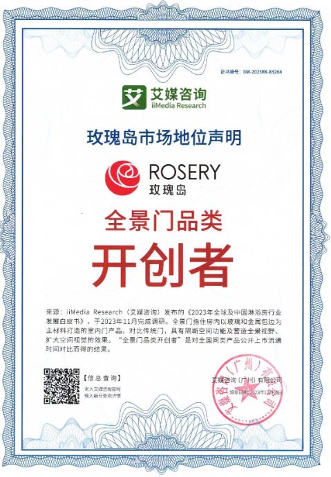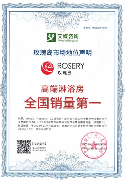 2023年12月,全球新經濟產業第三方數據挖掘和分析機構iiMedia Research(艾媒咨詢)發布《2023年全球及中國淋浴房行業發展白皮書》,玫瑰島被授予“高端淋浴房全國銷量第一”、“全景門品類開創者”及“全球最窄邊框淋浴房品牌”三項市場地位聲明認證。