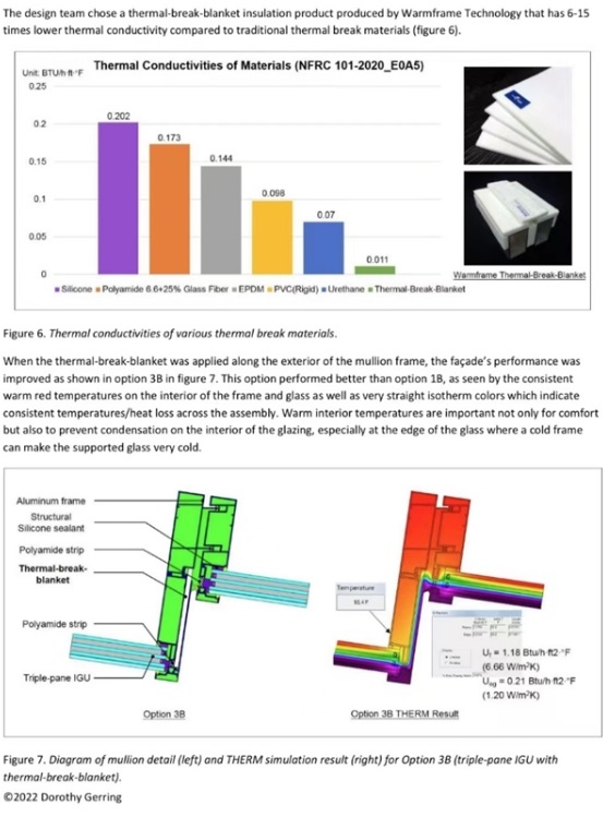 美國(guó)賓夕法尼亞理工學(xué)院建筑與可持續(xù)發(fā)展系Dorothy Gerring教授,于2019年出版的 《建筑師的可再生能源系統(tǒng)》 一書(shū)中系統(tǒng)研究了Warmframe暖框科技的幕墻隔熱毯技術(shù),熱工設(shè)計(jì),幕墻隔熱毯的設(shè)計(jì)方式,及工程系統(tǒng)質(zhì)保管理,研究表明THERM建模如何成為決定立面元素性能的重要部分。超高層建筑必須滿(mǎn)足綠色建筑節(jié)能,可持續(xù),安全,及耐久性能等關(guān)鍵技術(shù)要求。設(shè)計(jì)團(tuán)隊(duì)發(fā)現(xiàn),這意味著幕墻的U值要求非常高,設(shè)計(jì)師須解決氣密性和防潮性以及結(jié)構(gòu)安全問(wèn)題的同時(shí),確定如何滿(mǎn)足能源效率需求、實(shí)現(xiàn)成本效益,并驗(yàn)證系統(tǒng)設(shè)計(jì)的性能,而不犧牲立面的美觀性。設(shè)計(jì)團(tuán)隊(duì)采用了Warmframe幕墻隔熱毯創(chuàng)新技術(shù)作為解決外墻U值要求下的高性能隔熱材料應(yīng)用設(shè)計(jì)系統(tǒng),以滿(mǎn)足期望的綜合建筑性能,設(shè)計(jì)自由度,以及高質(zhì)量工程系統(tǒng)管理要求。