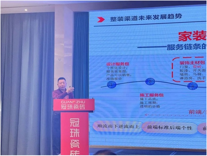 冠珠瓷磚品牌總經(jīng)理潘瀚在開場致辭中向大家分享了冠珠市場策略部署。他指出,當(dāng)前是市場爭奪的關(guān)鍵時(shí)刻,應(yīng)積極布局整裝市場,優(yōu)化產(chǎn)品結(jié)構(gòu),拓展家裝渠道,建立巖板交付系統(tǒng),并整合流量資源以推動營銷,搶占市場先機(jī)。冠珠總部亦將持續(xù)支持經(jīng)銷商們建立完善的品牌運(yùn)營模式,研發(fā)符合消費(fèi)者需求的新產(chǎn)品,以提升市場占有率。
