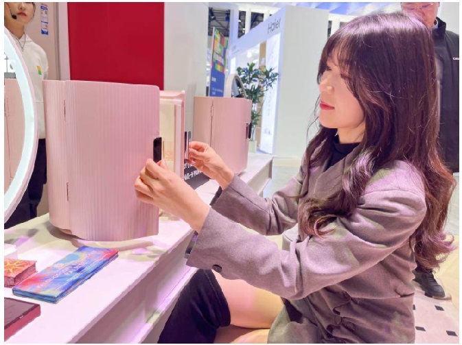 自信妝容,治愈完美顏值。有人將美躍然紙上,有人則將自己作為“畫布”,展現自信與顏值的魅力。這樣的場景,就發生在Leader小仙貝美妝冰箱的旁邊。在粉色夢幻的美妝冰箱旁,一位美妝博主素顏出鏡發起爆改挑戰。她不斷從冰箱取出彩妝產品,邀請路人為她上妝。最終,她竟親手將妝容改為個性的鬼馬少女風,驚艷全場。