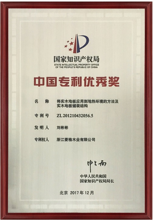 2017年12月,天格憑借“將實(shí)木地板應(yīng)用到地暖環(huán)境的方法及實(shí)木地板鋪裝結(jié)構(gòu)”專利,榮獲第十九屆“中國專利優(yōu)秀獎(jiǎng)”。獲得此次大獎(jiǎng),正由于天格將系列專利技術(shù)融會(huì)貫通,于2002年打破“實(shí)木地板不能應(yīng)用于地暖環(huán)境”的行業(yè)難題,進(jìn)而發(fā)明了“地暖實(shí)木地板”這一中國原創(chuàng)地板品類,并全力推廣使其成為“美好生活”的重要元素,實(shí)現(xiàn)了理論創(chuàng)新和產(chǎn)品普及雙重突破的貢獻(xiàn)。中國專利獎(jiǎng)是我國專利領(lǐng)域的最高獎(jiǎng)項(xiàng),由國家知識(shí)產(chǎn)權(quán)局設(shè)立,是我國唯一的專門對授予專利權(quán)的發(fā)明創(chuàng)造給予獎(jiǎng)勵(lì)的政府部門獎(jiǎng)。這一獎(jiǎng)項(xiàng)的獲得,權(quán)威證明了天格作為地暖實(shí)木地板品類發(fā)明者的地位,也是國家對天格地暖實(shí)木地板在創(chuàng)新方面的最高褒獎(jiǎng)和肯定。