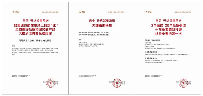 在售后保障方面,天格早在2020年就推出了涵蓋兩年保修、25年質(zhì)保、無理由退換貨等政策在內(nèi)的“五大承諾”售后保障體系。從購買時(shí)的退換貨,到超長的保修和質(zhì)保期,以及免費(fèi)翻新、免費(fèi)拆裝等增值服務(wù),幾乎貫徹了地板的整個(gè)消費(fèi)生命周期!拔宕蟪兄Z”的提出給予了消費(fèi)者最安心的消費(fèi)保障,深刻踐行了“售后保障不麻煩”,切實(shí)提供了用戶的消費(fèi)體驗(yàn)。2024年,天格更將其中的“兩年保修”升級為“三年保修”(國家標(biāo)準(zhǔn)為一年),再一次刷新行業(yè)紀(jì)錄。
