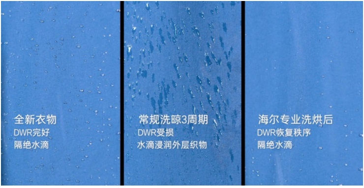 接下來可以看到,一件全新的沖鋒衣在經過常規洗晾三周期后,防水涂層已經受損,出現了水滴浸潤外層織物的情況。相反的,經過海爾洗衣機、干衣機的專業洗護,不僅能深度去除沖鋒衣內外層的污漬,還能長效保持防水涂層的性能,讓沖鋒衣煥然一新。