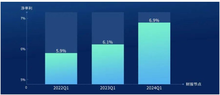 橫向來看,過去三年一季報,海爾智家的凈利率從2022Q1的5.9%提升到2023Q1的6.1%,再到2024Q1的6.9%。