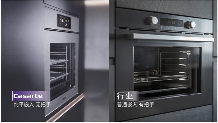 三看蒸烤箱:同為嵌入設(shè)計(jì),卡薩帝蒸烤箱能實(shí)現(xiàn)純平嵌入,無(wú)把手設(shè)計(jì)能讓它的正面與櫥柜平齊;普通嵌入式蒸烤箱則受傳統(tǒng)把手限制,很難做到純平嵌入。