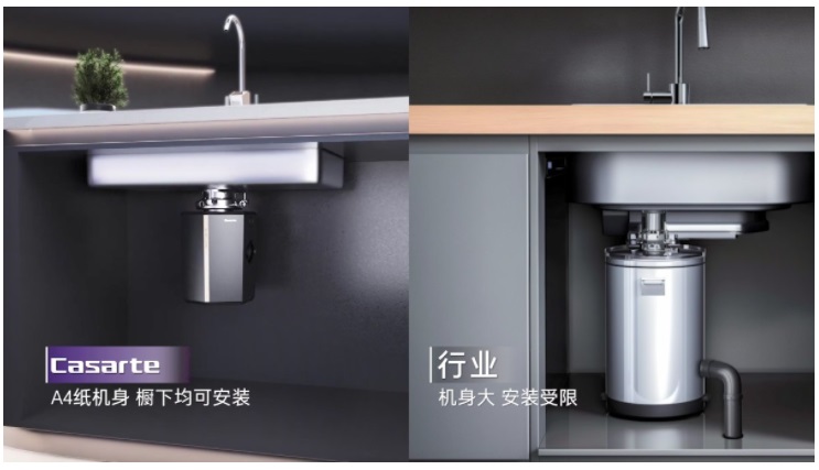 四看垃圾處理器:通過(guò)對(duì)比,卡薩帝垃圾處理器創(chuàng)新小機(jī)身,一張A4紙大小的位置即可安裝,幾乎不受到櫥下空間的限制;而普通垃圾處理器機(jī)身更大,很難裝在狹小的櫥下空間。